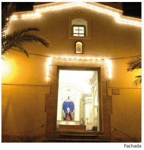 Exteriormente se accede a ella por una gran escalinata en su austera fachada principal rematada por una espadaña con campana. Desde su  fachada lateral exenta, se aprecian los detalles constructivos del edificio como los sillares en las esquinas y muros de mampostería. Las cubiertas son de teja árabe sobre las que se eleva una cúpula de media naranja con linterna y un pequeño cupulín sobre el Camarín de la titular.