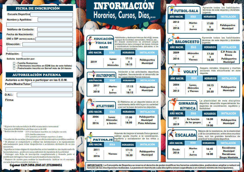 - SEGURO: Todos los niños inscritos en las E.D.M. están cubiertos por un seguro de accidentes, incluido en la cuota de inscripción. El seguro solo cubre aquellos accidentes que tengan lugar durante la práctica deportiva de las E.D.M. Además se realizará un reconocimiento médico a todos los alumnos inscritos.