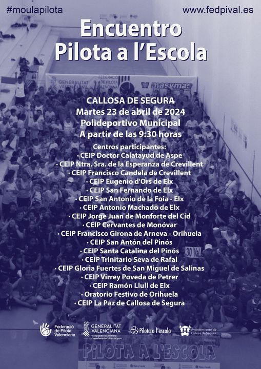 Este martes tenemos en el polideportivo municipal de Callosa de Segura un encuentro de pilota valenciana a l’escola, donde se darán cita 18 colegios con alumnos de 4º de primaria de toda la provincia de Alicante. Les deseamos mucha suerte a todos los participantes en especial a al CEIP La Paz de Callosa de Segura. Colaboran las Concejalías de Deportes y la Concejalía de educación.