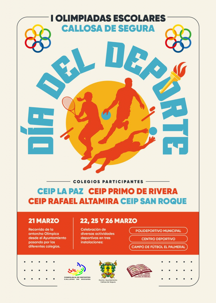Hoy dan comienzo en Callosa de Segura las I olimpiadas escolares y cuyas actividades se realizarán los próximos días viernes, lunes y martes clausurando el 26 de marzo que se celebrará el día del deporte.