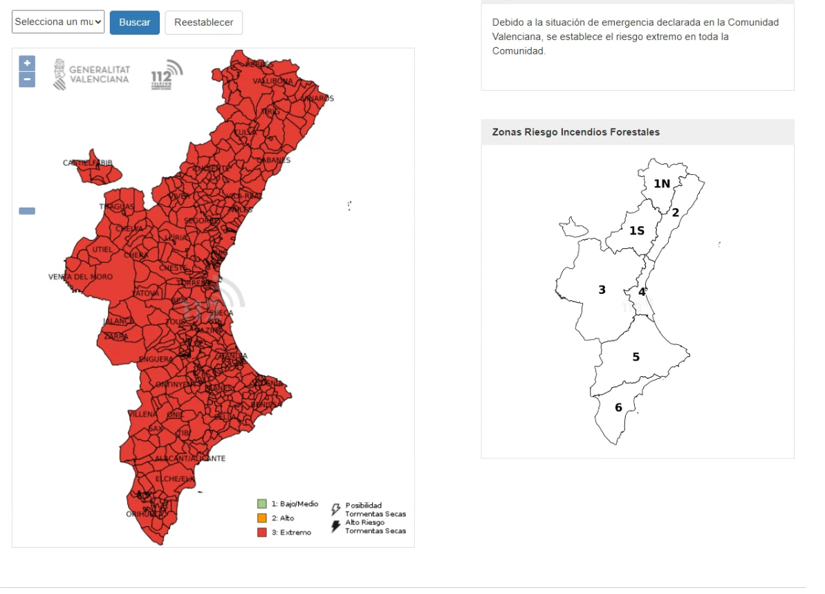 Debido a la situación de emergencia, en cuanto al nivel del riesgo de incendios Forestales declarada en la Comunidad Valenciana, se establece el riesgo extremo en toda la Comunidad Valenciana.