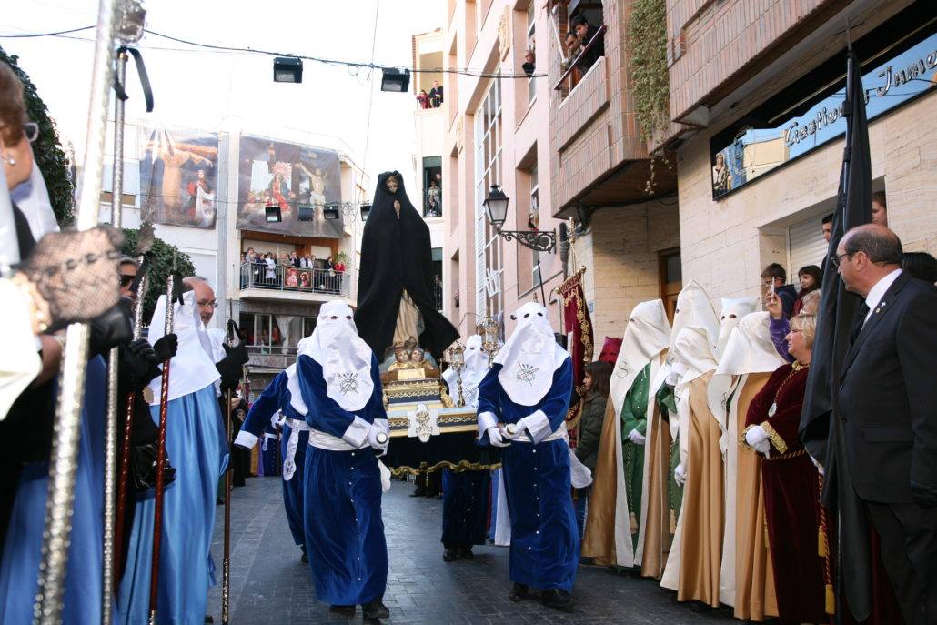 Es una tarde de riguroso luto en Callosa de Segura, en la que las mantillas toman las calles; cortejo fúnebre que aguanta el dolor en el interior de las mujeres que salen a la calle para cumplir con su devoción con la Semana Santa.