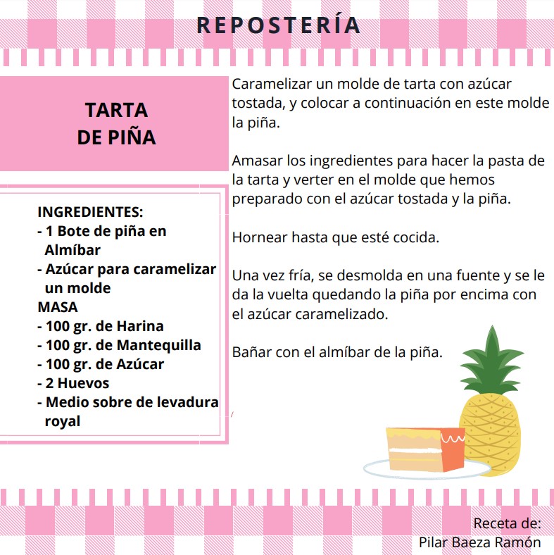 Hornear hasta que esté cocida. Una vez fría, se desmolda en una fuente y se le da la vuelta quedan do la piña por encima con el azúcar caramelizado. Bañar con el almíbar de la piña.