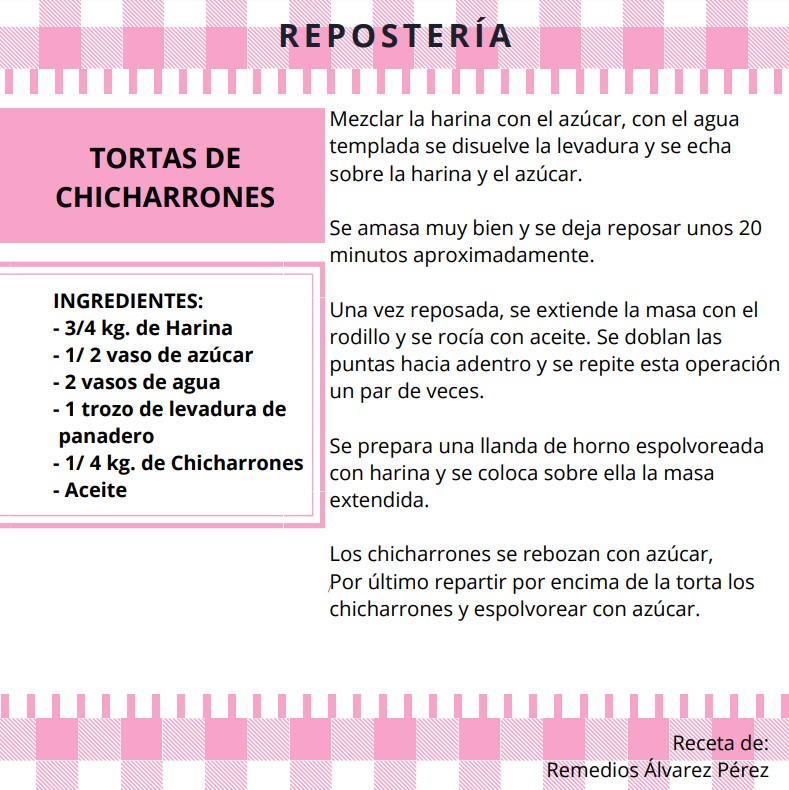 Una vez reposada, se extiende la masa con el rodillo y se rocía con aceite. Se doblan las puntas hacia adentro y se repite esta operación un par de veces. Se prepara una llanda de horno espolvoreada con harina y se coloca sobre ella la masa extendida. Los chicharrones se rebozan con azúcar.