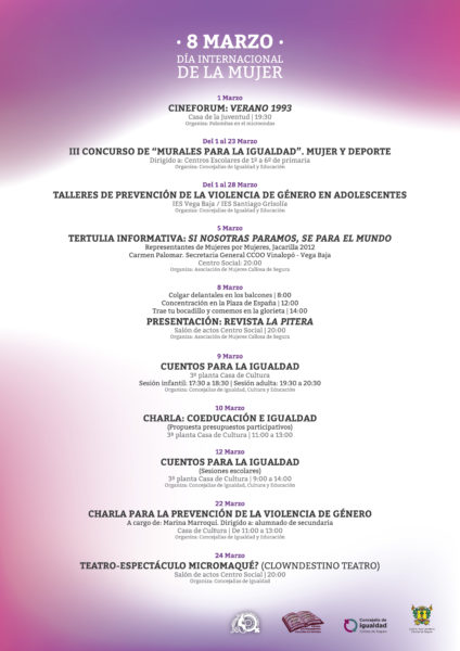 La Concejalía de Igualdad del Excmo. Ayuntamiento de Callosa de Segura, presenta un amplio programa de actividades que, con motivo del día 8 de Marzo Día Internacional de la Mujer, se van a llevar a cabo en nuestro municipio durante todo el mes de marzo.