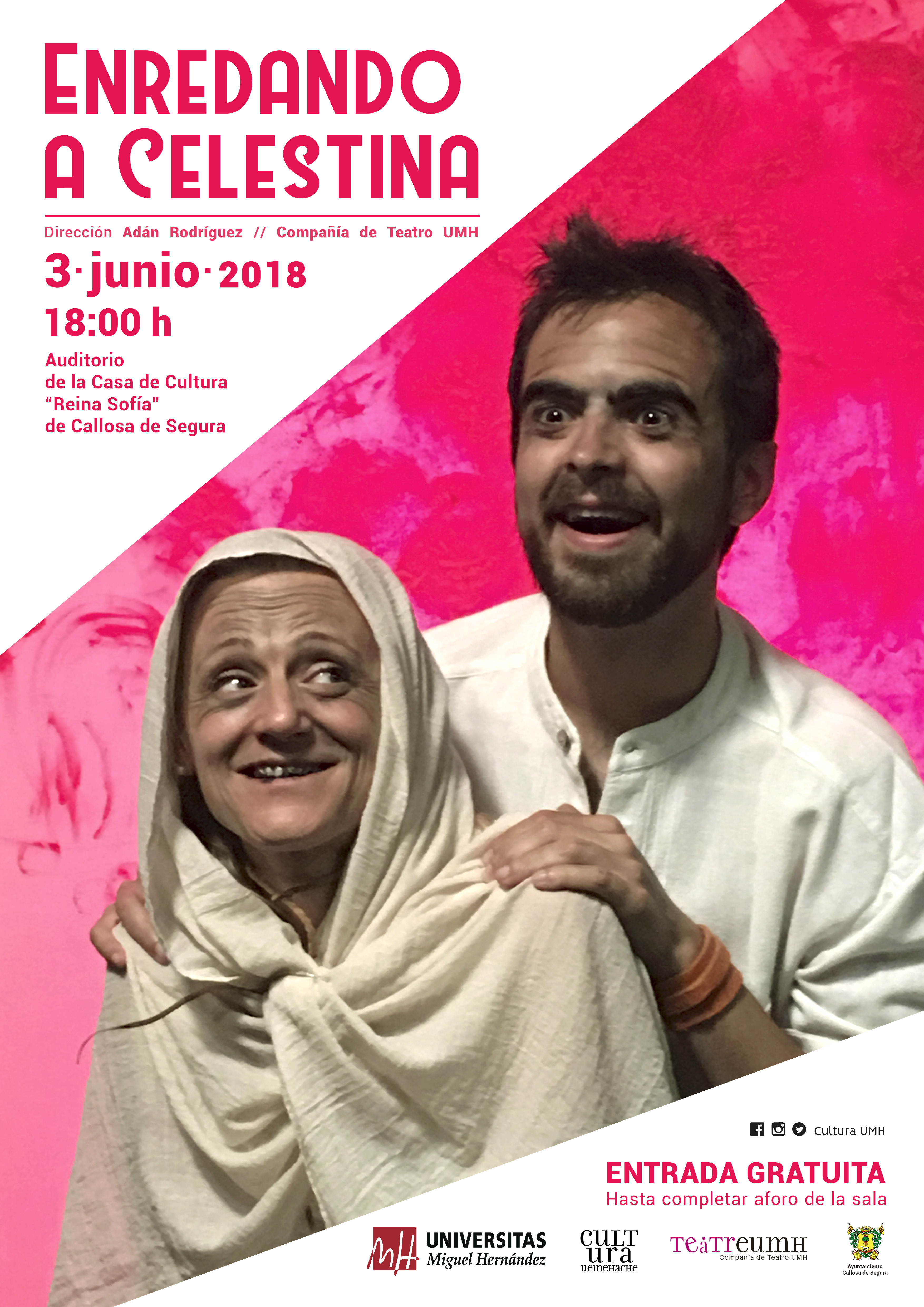 Para finalizar, el domingo a las 18:00 horas de la mano del director Adán Rodríguez y junto a la compañía de teatro de la Universidad Miguel Hernández, se representará la obra de teatro “Enredando a Celestina”, una versión libre de la universal obra de Fernando de Rojas, capitaneada en esta ocasión por Parmeno y Sempronio. Nos ofrece una comedia chocante donde reinará el disparate y la sinrazón de sus propios personajes, que luchan contra el mundo y contra sí mismos con el objeto de disfrutar y pensar el mundo de hoy. La entrada para esta actividad será gratuita hasta completar aforo de la sala.
