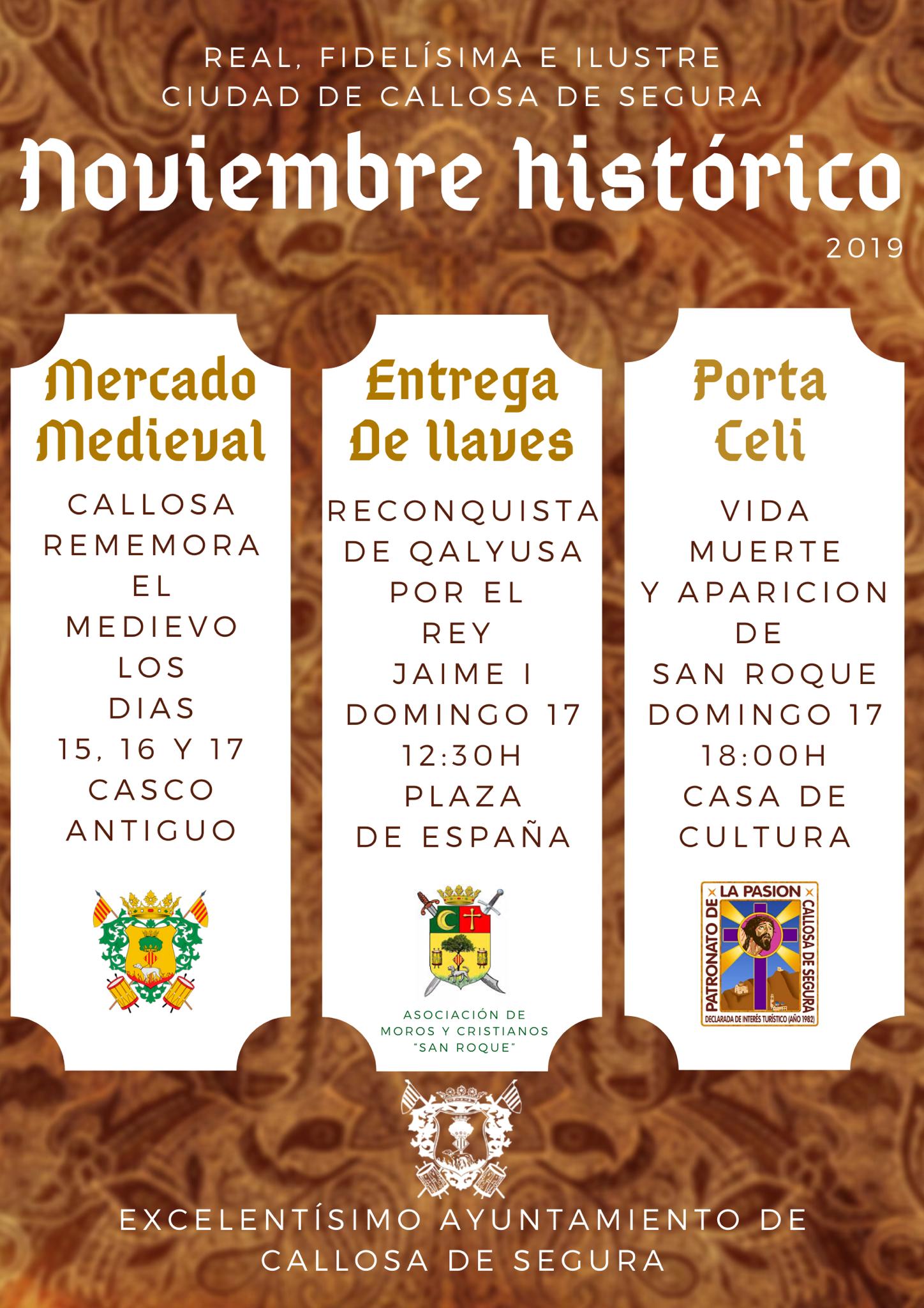 El Ayuntamiento de Callosa de Segura, viene celebrando desde hace varios años las efemérides de un mes que para los callosinos y callosinas representa una fecha muy especial, el «Noviembre histórico». Durante el mes de Noviembre, se celebra la constitución en la ciudad de un Ayuntamiento independiente; la reconquista cristiana de la ciudad por parte de Jaime I; el título de ciudad otorgado por el rey Alfonso XIII; la declaración de la Arciprestal de San Martín como monumento nacional, la aparición del patrón San Roque,…