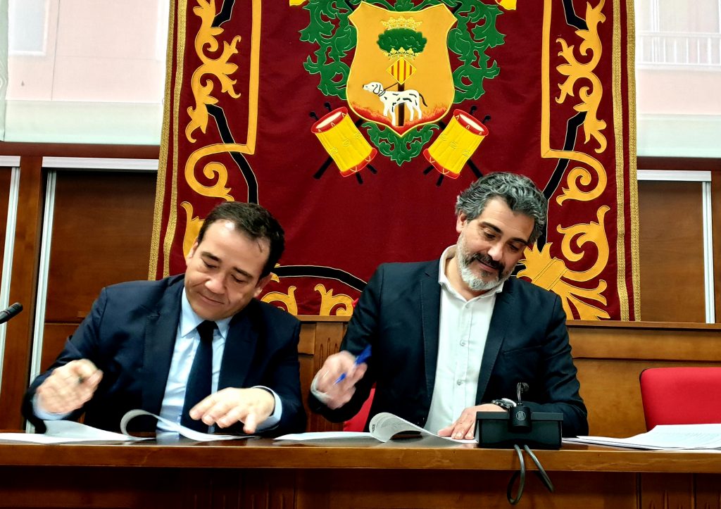 En el salón de plenos del Ayuntamiento del municipio han firmado el acuerdo de colaboración entre D. Manuel Illueca Muñoz, director general del Institut Valencià de Finances (IVF), y Francisco José Maciá Serna, alcalde de Callosa.