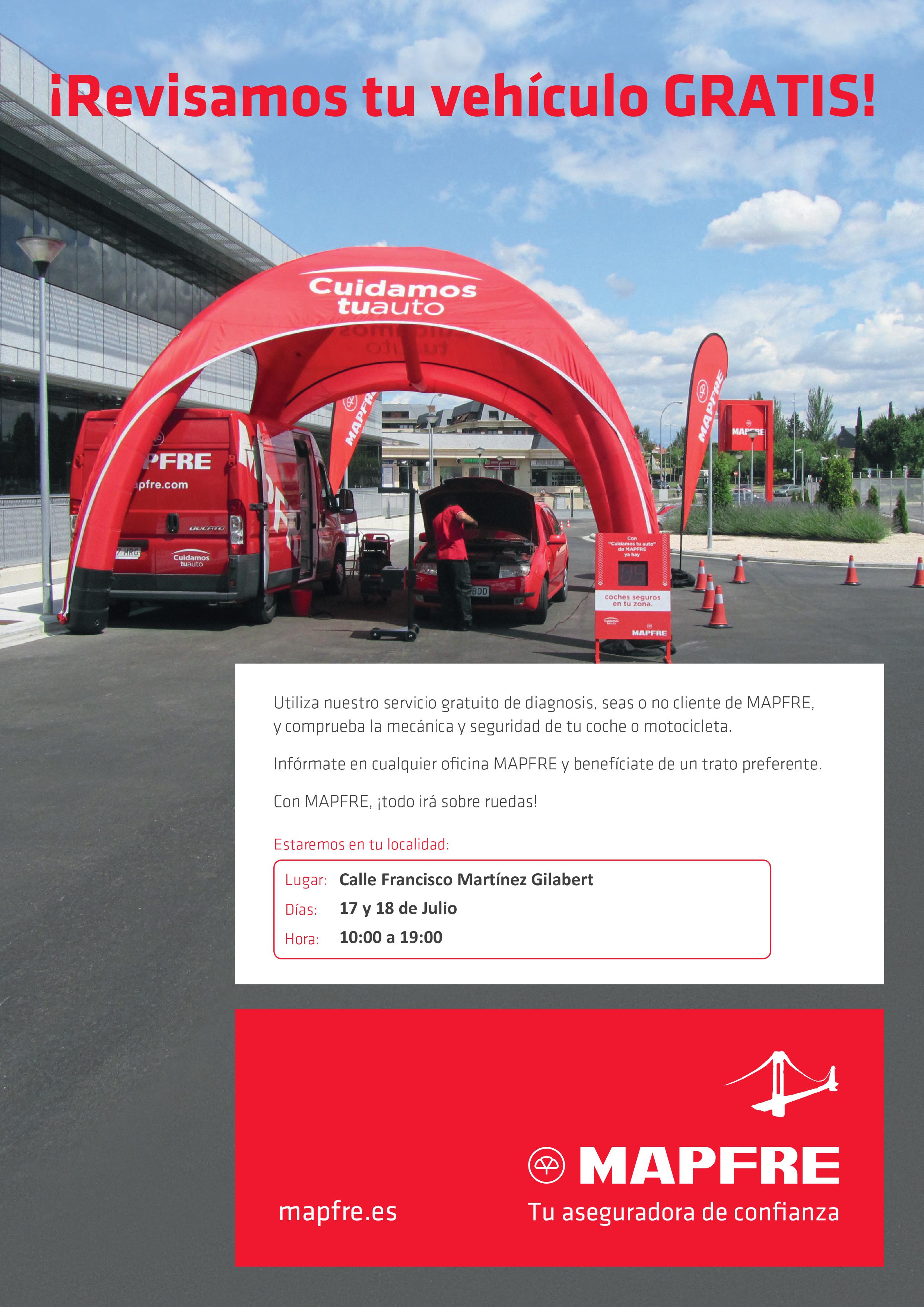 Durante los días 17 y 18 de julio, con horario de 10 a 19 horas en la calle Francisco Martínez Gilabert, y totalmente gratuita para todos los vecinos del municipio independientemente de tener contratado cualquier servicio con esta aseguradora, se llevará a cabo este servicio de diagnosis que comprobará la mecánica y seguridad de coches y motocicletas revisando los elementos más importantes del vehículo, como son el alumbrado y señalización, las ruedas y neumáticos, el acondicionamiento exterior e interior, las emisiones contaminantes, los sistemas electrónicos, el motor, la dirección, la suspensión y los frenos.