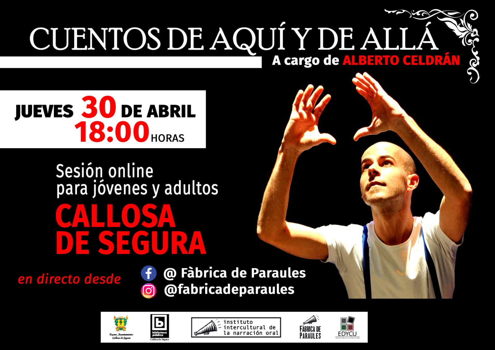 Y el Día 30 de abril con Alberto Celdrán Sesión de cuentacuentos “en directo” a partir de las 18 h para jóvenes y adultos: «CUENTOS DE AQUÍ Y ALLÁ»