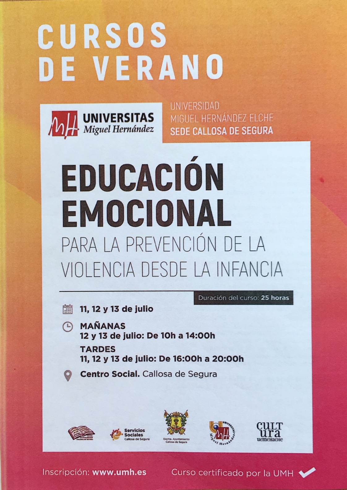 El primero, titulado “Educación emocional para la prevención de la violencia desde la infancia” tendrá una duración de tres días (25 horas). La UMH también ha programado del 18 al 20 de julio el curso “La mediación: emociones, necesidades y comunicación en la mediación”. Cada curso tiene un coste económico de 20€.