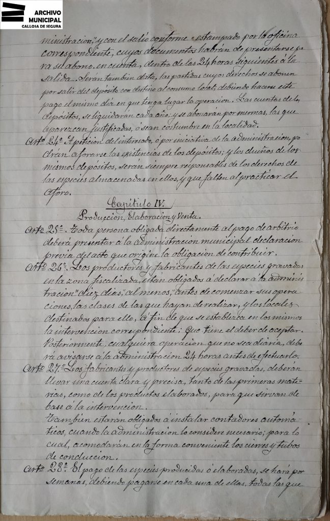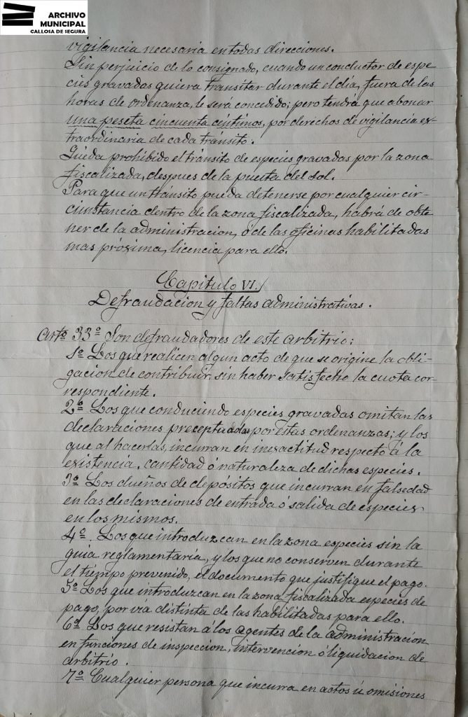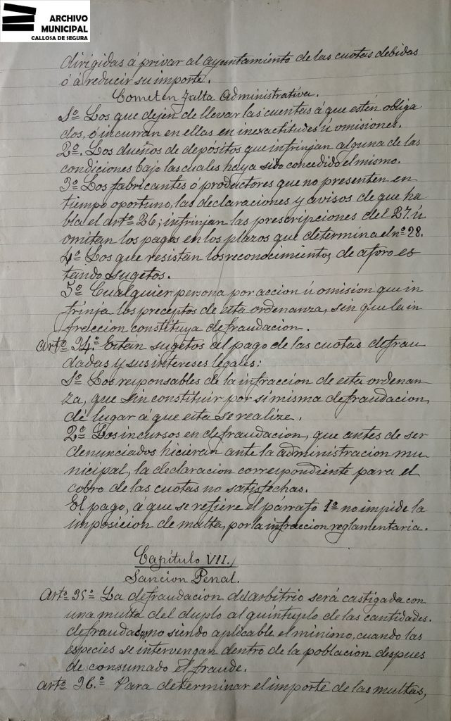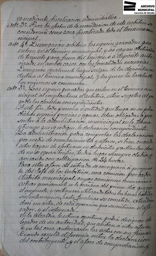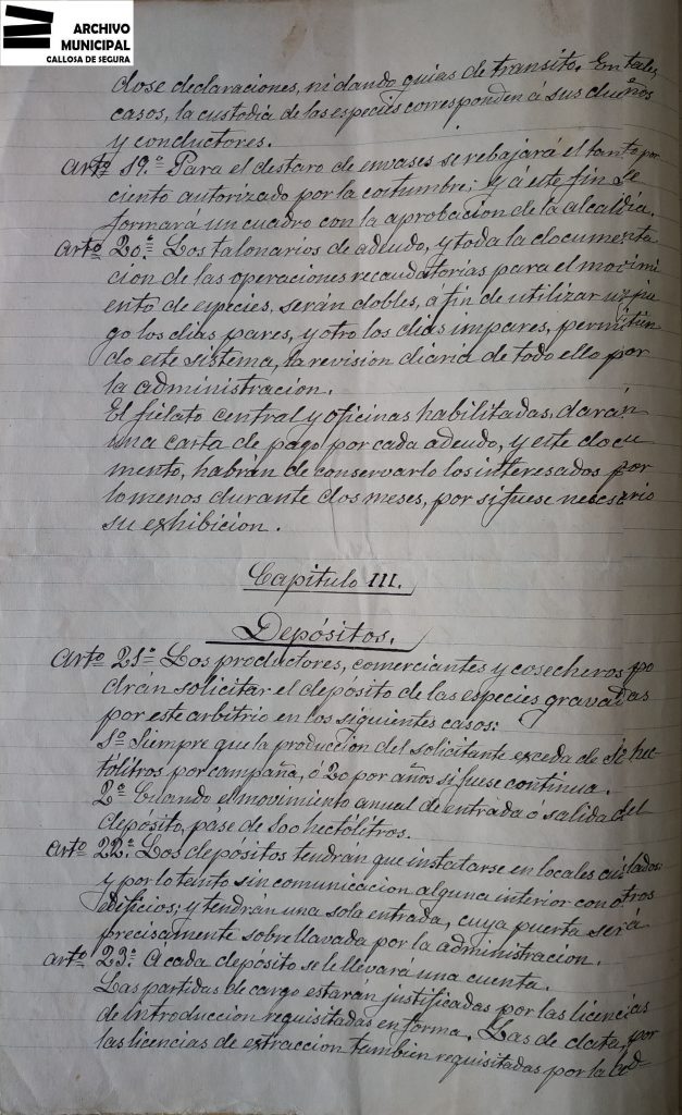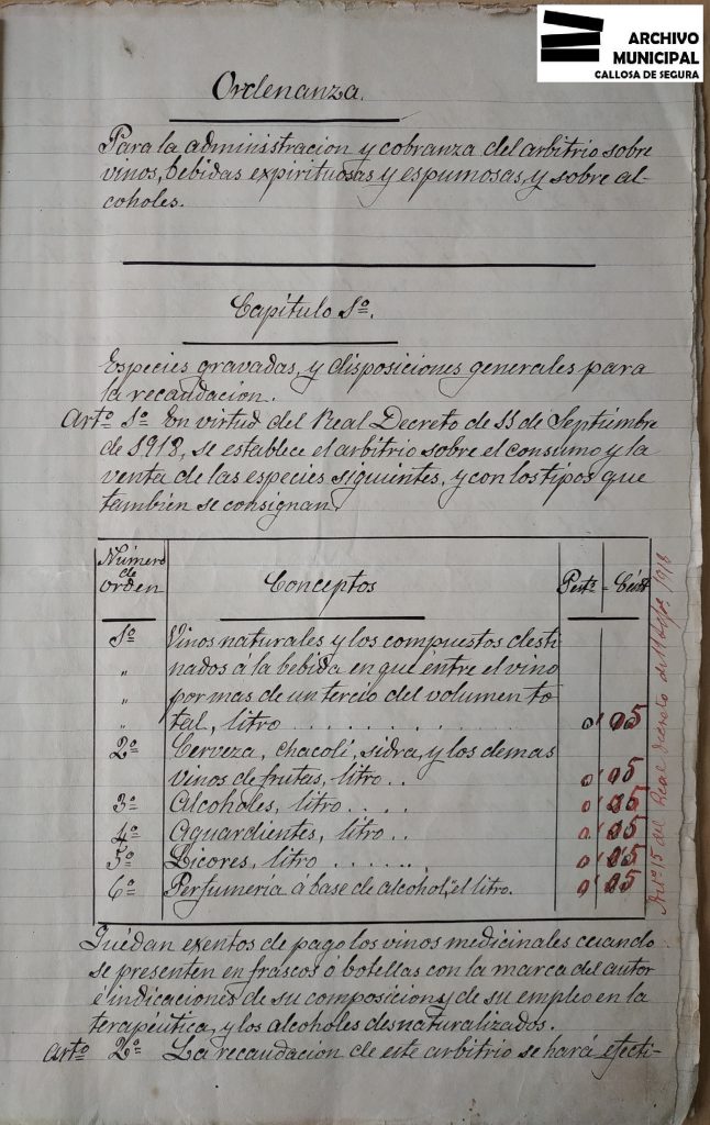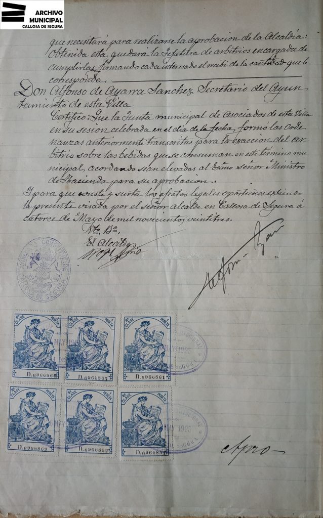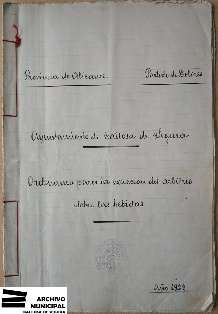 La ordenanza para la exacción del arbitrio sobre las bebidas que se consumían dentro del término municipal, se formó por la Junta Municipal de Asociados de esta Villa en su sesión celebrada el catorce de mayo de 1923, para la administración y cobranza del arbitrio sobre vinos, bebidas expirituosas y espumosas, y sobre alcoholes, siendo alcalde Don Roque Pina y actuando como secretario Don Alfonso de Ayarra Sánchez.