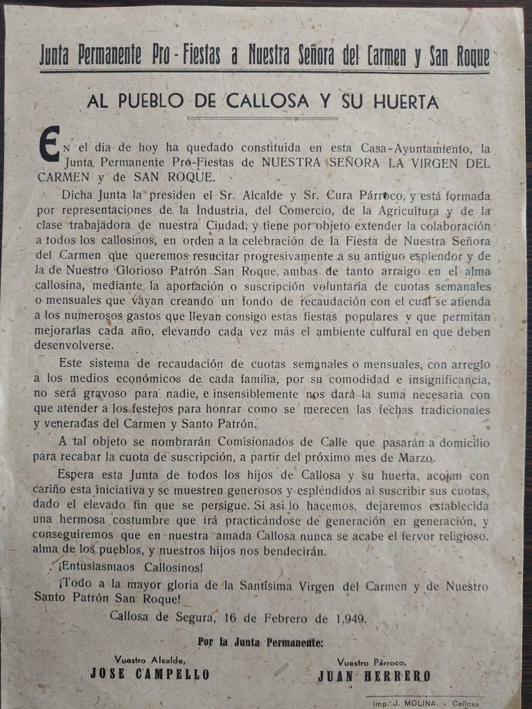 La Junta Permanente Pro-Fiestas, esperaba la colaboración y generosidad de todos los hijos de Callosa y su huerta, y dejar establecida una costumbre de cuotas para atender a los festejos de fechas tradicionales.