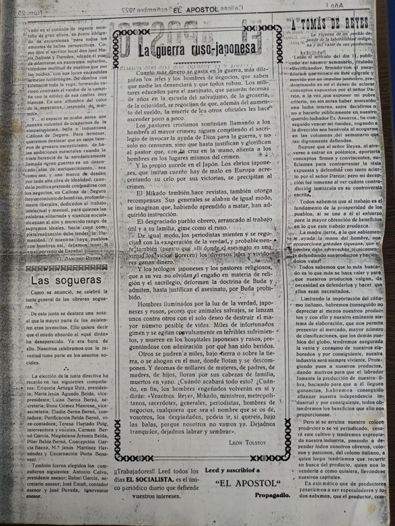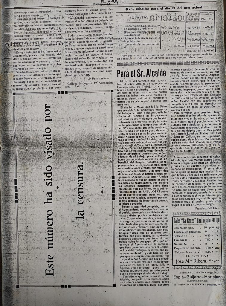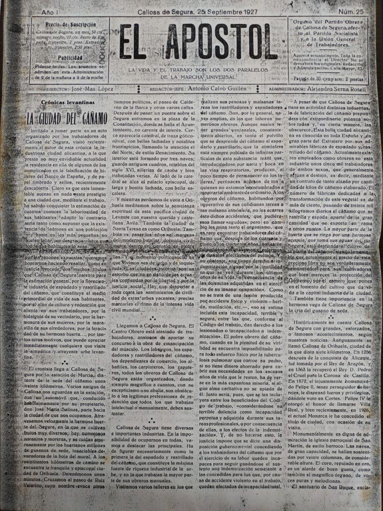 El Apóstol, semanario que surge el 6 de marzo de 1927, fue el órgano de la Casa del Pueblo de Callosa de Segura, dirigido por José Más López, y que durante el periodo de 1931-1933 difundía, 600 ejemplares semanales, El número se vendía a 10 céntimos, habitualmente tenía cuatro páginas y sus dimensiones eran de 41,5×32 cms.