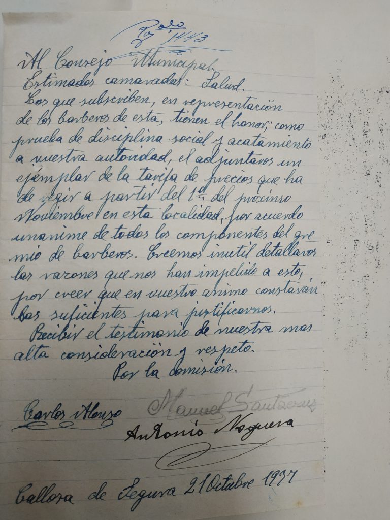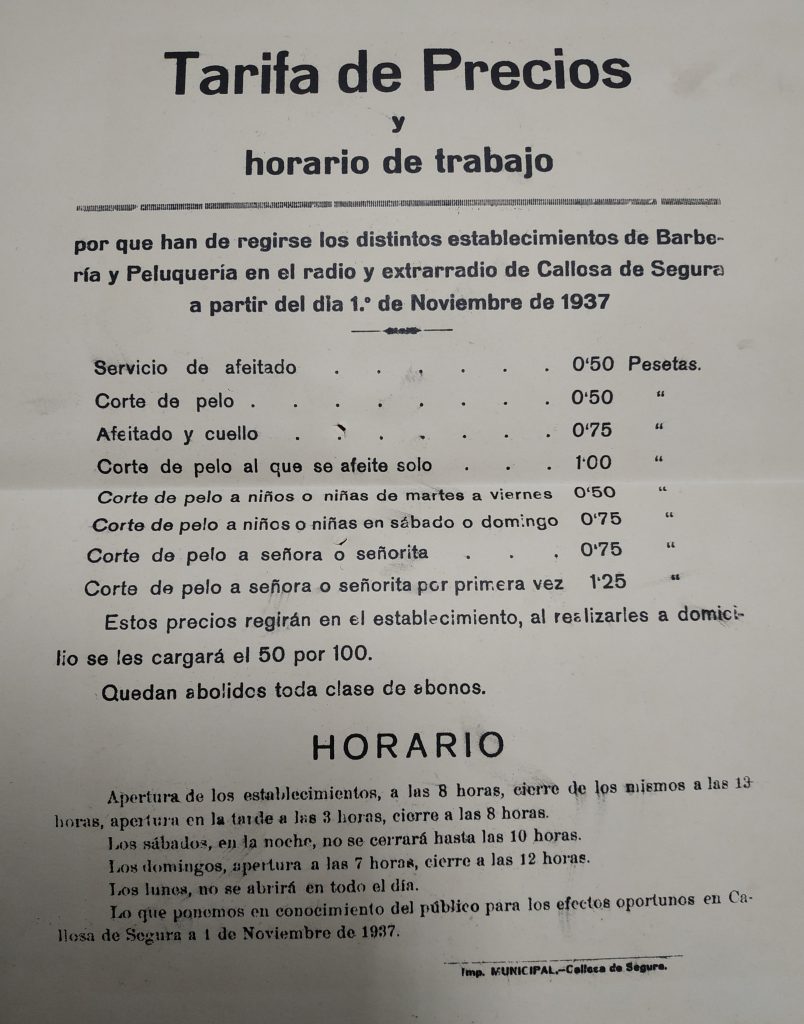 El 21 de octubre de 1937, representantes del gremio de barberos de nuestra Ciudad presentaron al Consejo Municipal la “Tarifa de precios y horario de Trabajo de los distintos establecimientos de barbería y peluquería en el radio y extrarradio de Callosa de Segura”, para que fueran autorizados por los componentes de dicho Consejo. Todo ello se pone en conocimiento del público a los efectos oportunos a partir del 1 de noviembre de 1937.