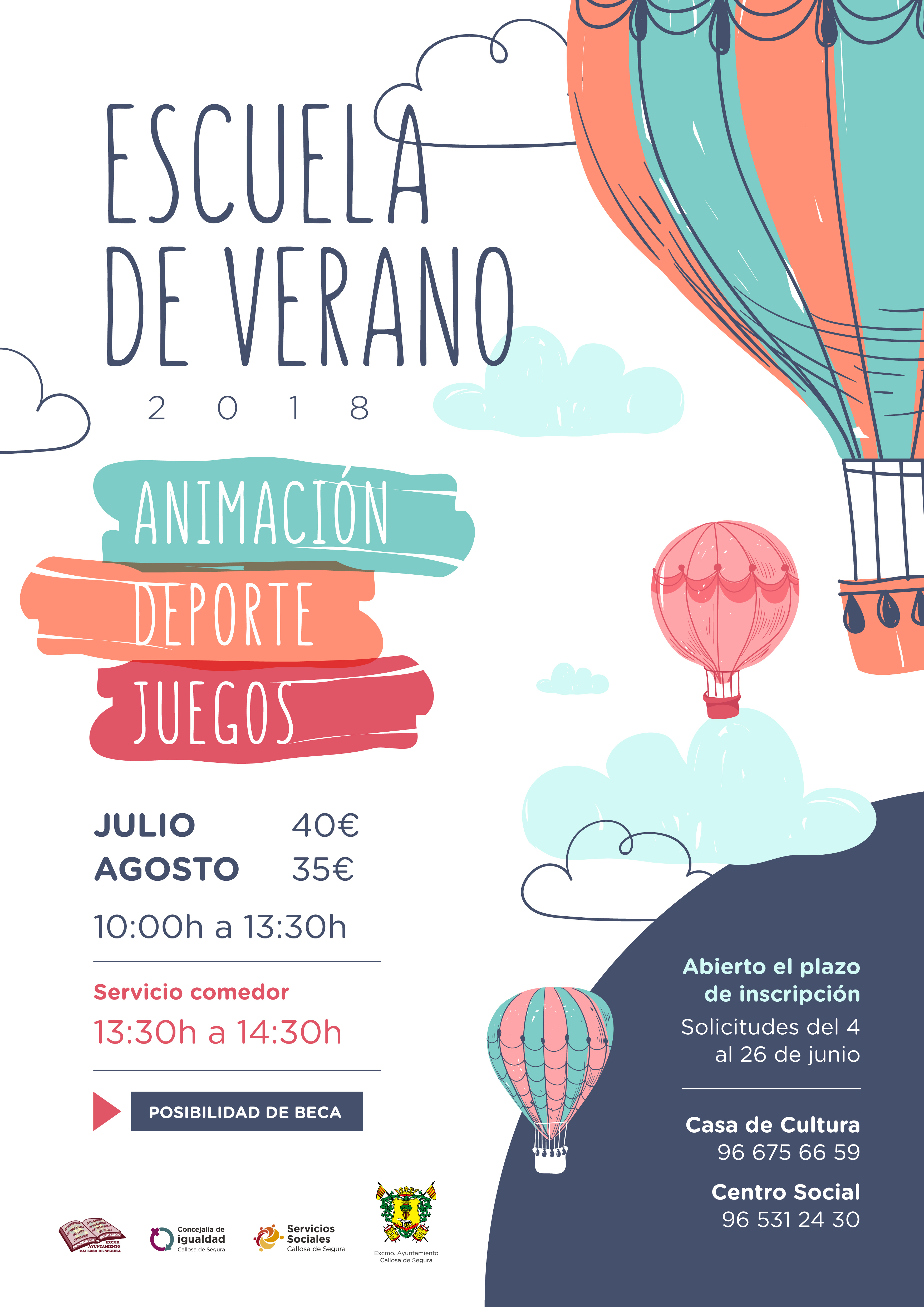 Como en años anteriores, la Concejalía de Servicios Sociales de Callosa de Segura en colaboración con la Concejalía de Educación pone en marcha la “Escuela de Verano 2018”. El programa que está dirigido a menores de 3 a 12 años de la localidad se desarrollará en el CEIP Primo de Rivera los meses de julio y agosto, consistiendo en la realización de actividades lúdico-educativas orientadas a estimular las capacidades de los menores. Además, contará con servicio de comedor, al que podrán acceder todas aquellas personas interesadas, facilitando así la conciliación de la vida familiar y laboral.