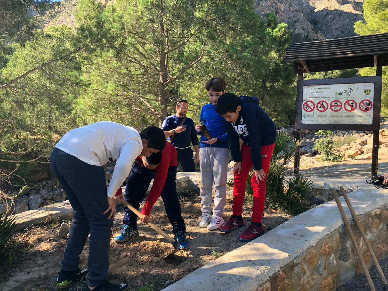 Los alumnos han procedido a la planta de arbustos y árboles autóctonos de la zona como el algarrobo o una variedad del ciprés. Además, se ha plantado tomillo, esparto y efedra.