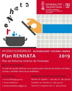 La Conselleria de Vivienda, Obras Públicas y Vertebración del Territorio destinará para este ejercicio 2019 un total de 3 millones de euros a las subvenciones para la mejora de las condiciones del interior de las viviendas del ‘Plan Renhata’, según ha publicado el Diario Oficial de la Generalitat Valenciana, (DOGV).