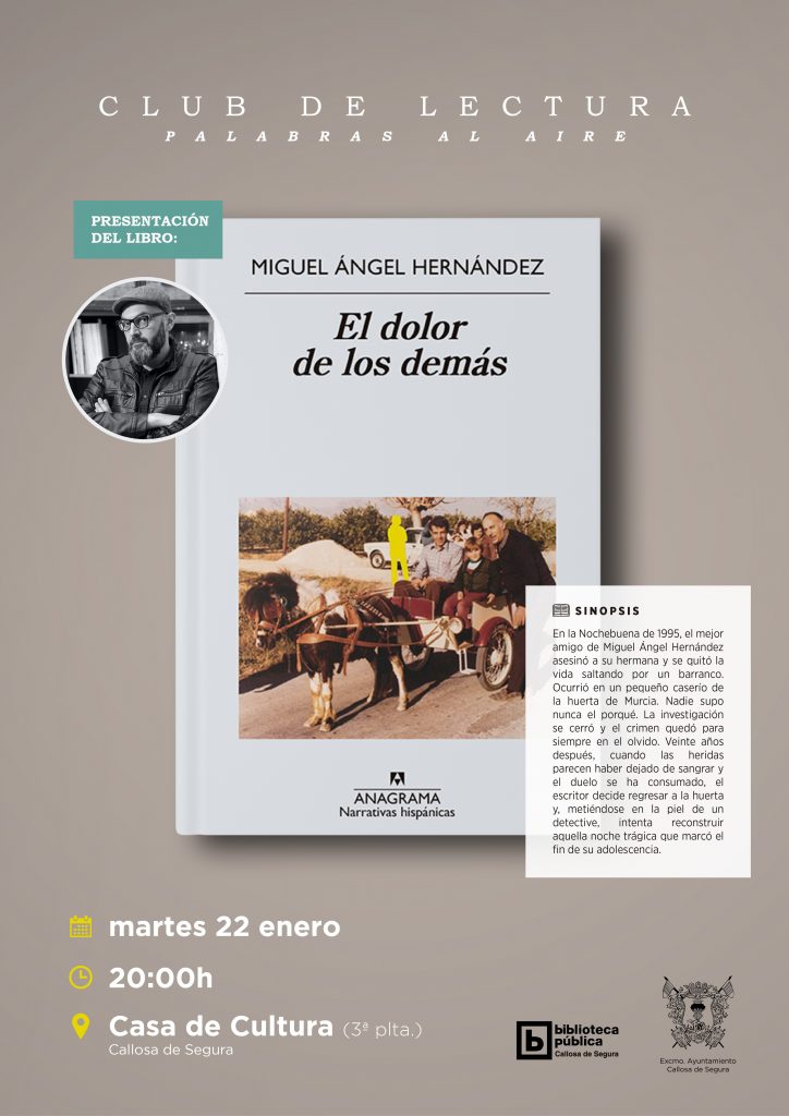 Dentro de las actividades que organiza el Club de Lectura “Palabras al aire” de la Biblioteca Pública Municipal “Francisco Salinas”, el martes 22 de enero a las 20 horas, tendrá lugar un encuentro con el escritor Miguel Ángel Hernández, en la 3ª planta de la Casa de Cultura, quien nos presentará su última obra, publicada (en 2018), por Editorial Anagrama, El dolor de los demás, novela descarnada y honesta, a medio camino entre el thriller policiaco y la confesión autobiográfica y que rompe de alguna forma con la temática de sus anteriores obras.