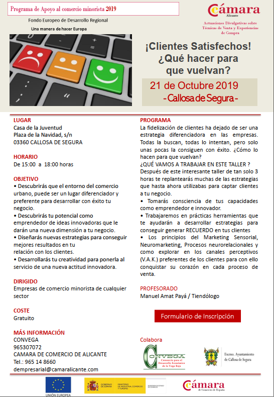 El próximo lunes 21 de octubre en la localidad de Callosa de Segura, en el marco del Plan de Apoyo al Comercio minorista 2019 impulsado por la Cámara de Comercio de Alicante, en colaboración del Consorcio para el Desarrollo Económico Vega Baja (CONVEGA) la concejalía de comercio del Ayuntamiento de Callosa de Segura pone en marcha el taller “¡Clientes Satisfechos! ¿Qué hacer para que vuelvan?”. El taller, de 3 horas de duración, se desarrollará en horario de 15:00 a 18:00 horas en la Casa de la Juventud y cuenta con 25 plazas, de forma gratuita, dirigido a comerciantes, empleados de comercio y emprendedores del sector comercial minorista. El taller será impartido por D. Manuel Amat Payá. Tiendólogo.