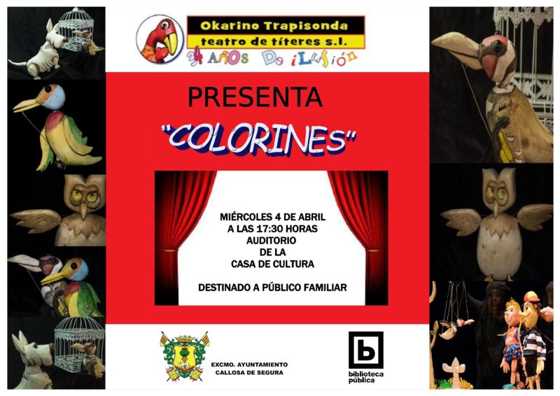En estos días de Pascua, donde los niños disponen de más tiempo libre, os invitamos a disfrutar con el Grupo Okarino Trapisonda y su espectáculo de títeres “Colorines”. Con ella nos harán disfrutar con sus marionetas y la historia de una amistad: “la de Dani y su pajarito “Colorines”. Dani desea que Colorines le acompañe al parque revoloteando alrededor de él, de igual manera que lo hace su perrillo Rufo. Pero Colorines nunca ha salido de la jaula, tiene miedo al exterior y no sabe volar. Dani le quiere enseñar, pero el miedo es muy fuerte y no lo consigue…”
