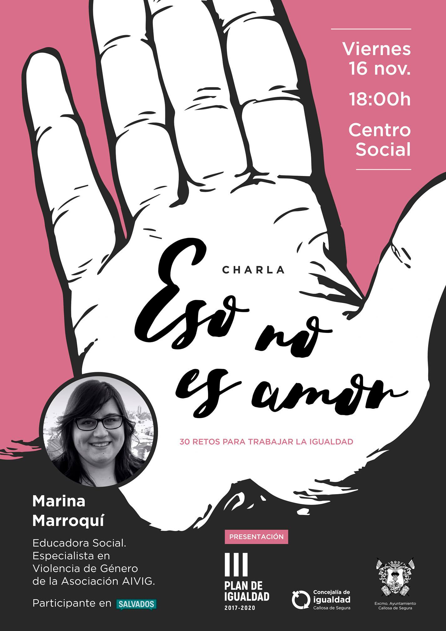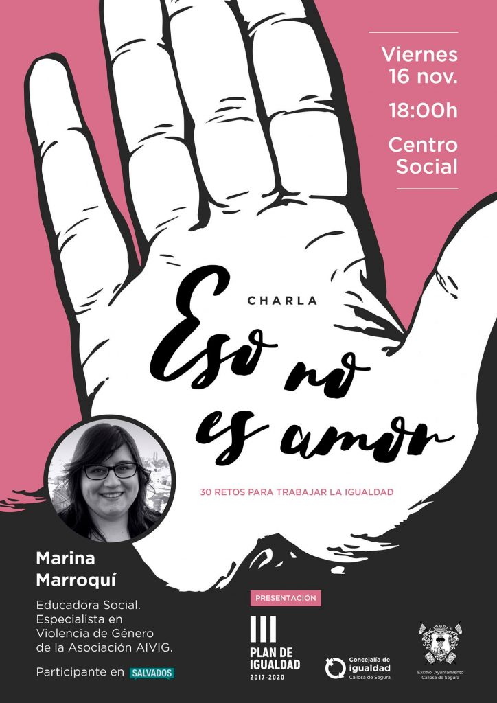 Además, el próximo viernes 16 de noviembre a las 18.00h en el Centro Social contaremos con Marina Marroquí, presidenta de la Asociación de Víctimas de violencia de género de Elche, educadora social y una referente hoy en esta materia para hablarnos de ‘Eso no es amor’.