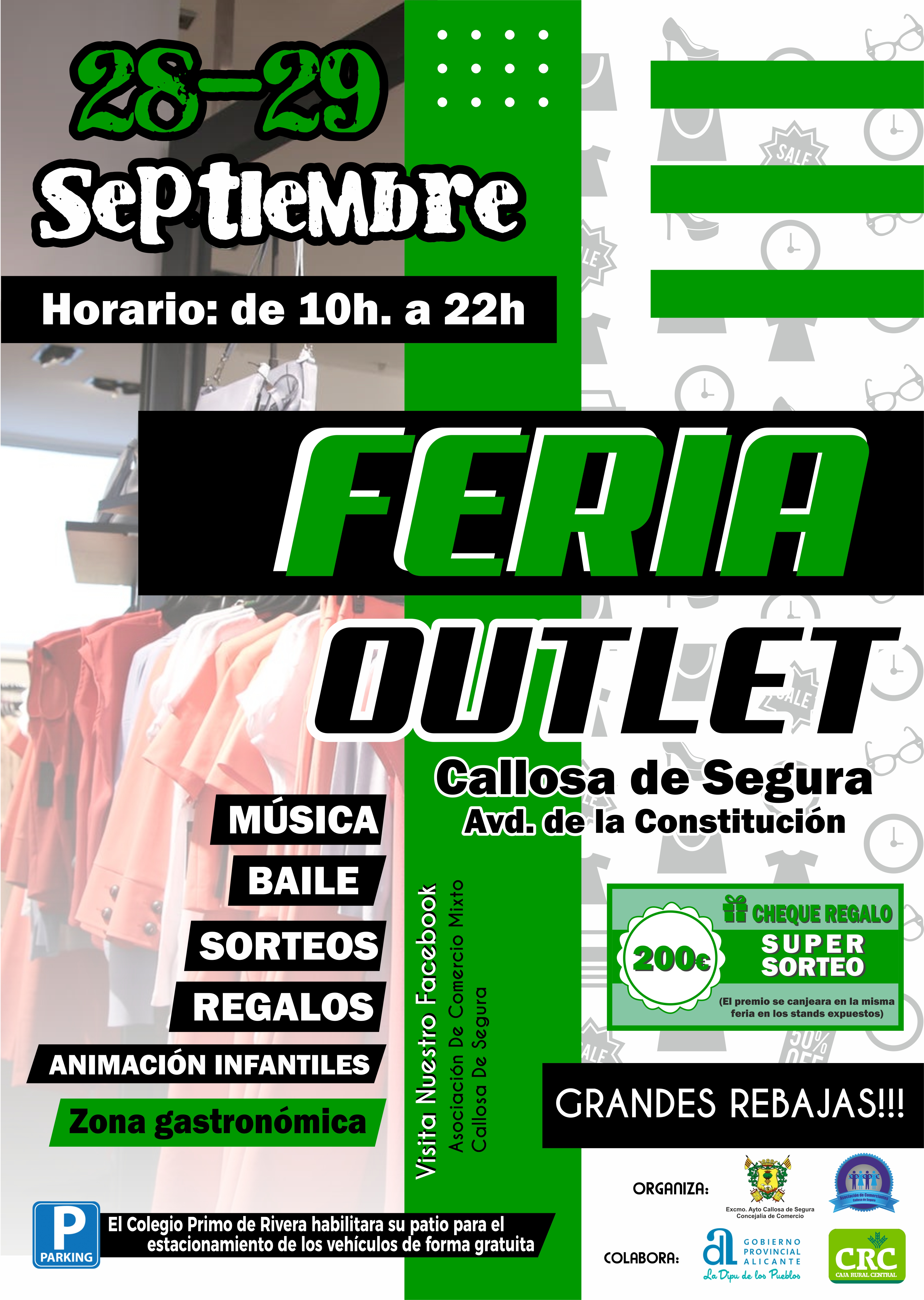 Vuelve una nueva edición de la feria outlet de Callosa de Segura, en una doble cita de sábado 28 y domingo 29 de septiembre en la Avenida de la Constitución de Callosa de Segura, donde a partir de las 10:00 horas del sábado vecinos y visitantes podrán disfrutar de una completa oferta de ocio y compra, donde se combinan los descuentos del comercio local con la oferta gastronómica del municipio.