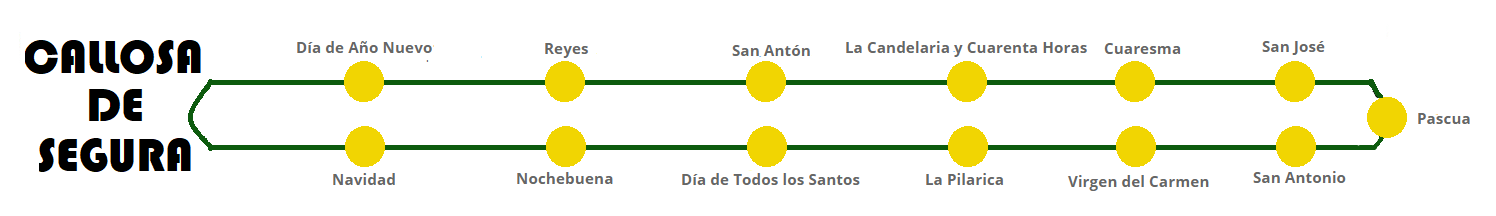 Un aspecto curioso digno de mención es que, desde mucho tiempo atrás y hasta la actualidad, las distintas festividades religiosas determinan las comidas tradicionales en los días más importantes del año en Callosa de Segura, y que son seguidas por la gran mayoría de vecinos.